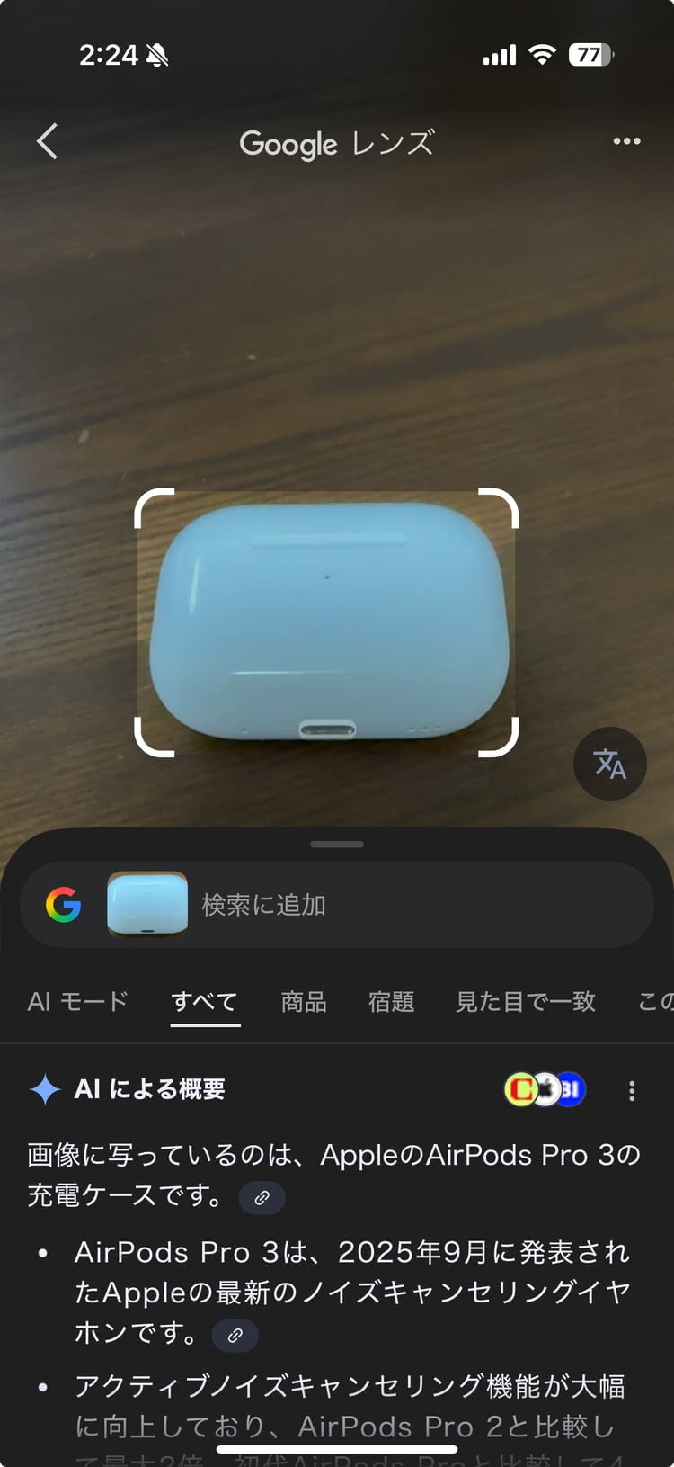 スマホの場合、枠内に物体を合わせることで、画像によるGoogle検索を行うことができます。