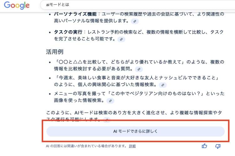 - 検索結果のAI Overview下部に表示される [AIモードでさらに詳しく]タブを選択